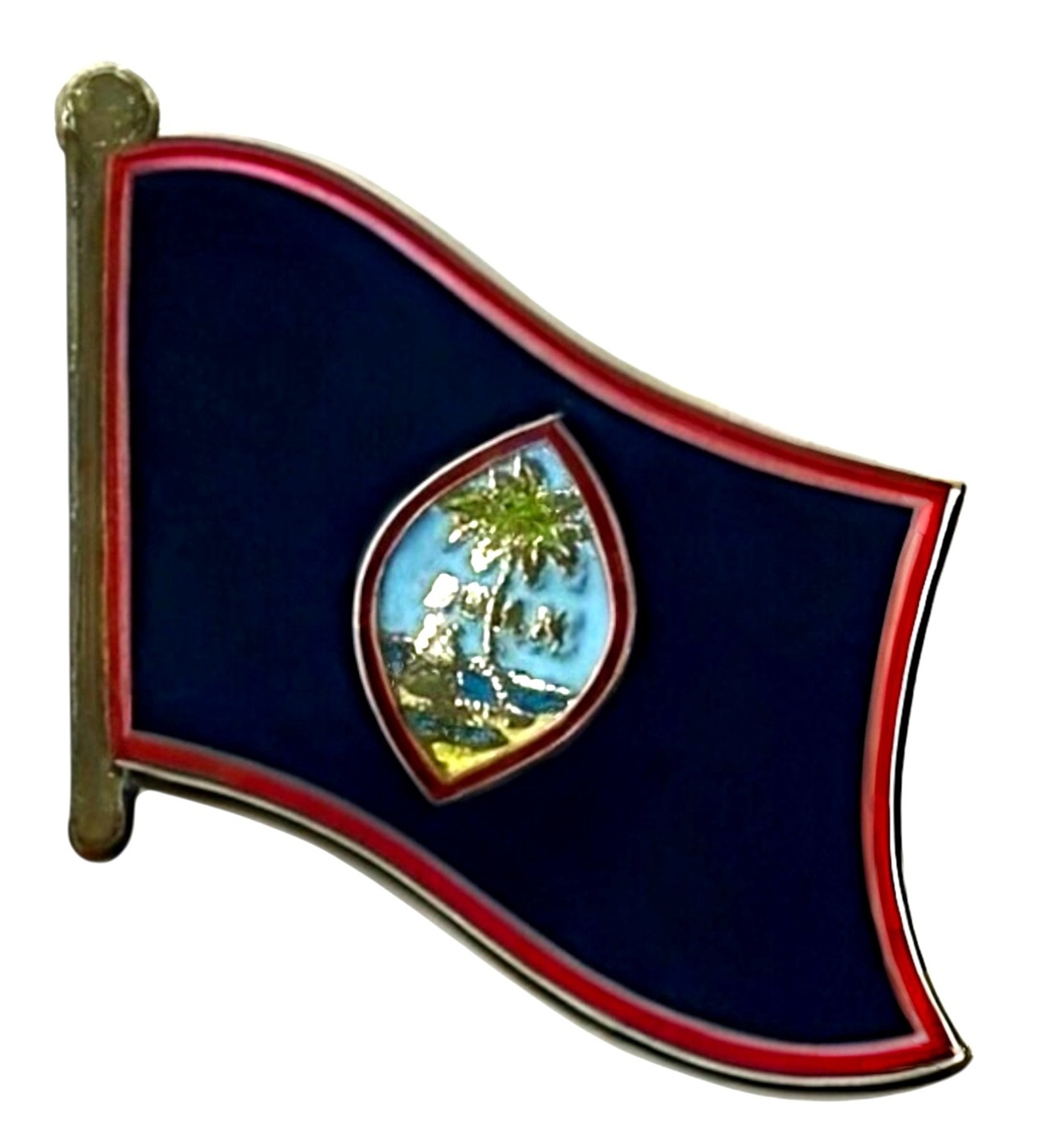 Guam flag pin measures approximately 1 inch; x 3/4 inch; or 24 mm x 16 mm and has an all metal lacquered design with clutch pin.