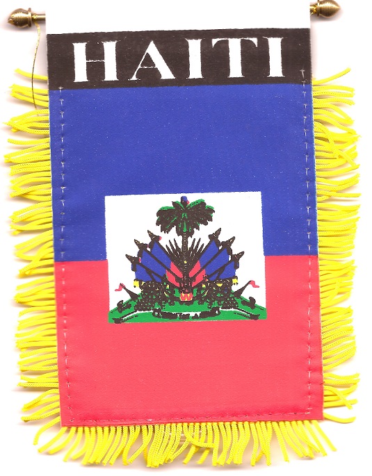 Haitian car windshield, window or mirror mini measure 3 1/2 x 5 inches; and are great ways to show your heritage. Each flag has a gold fringe with a string for hanging over your car mirror, and a suction cup to attach the mini flag to your windshield or car window.