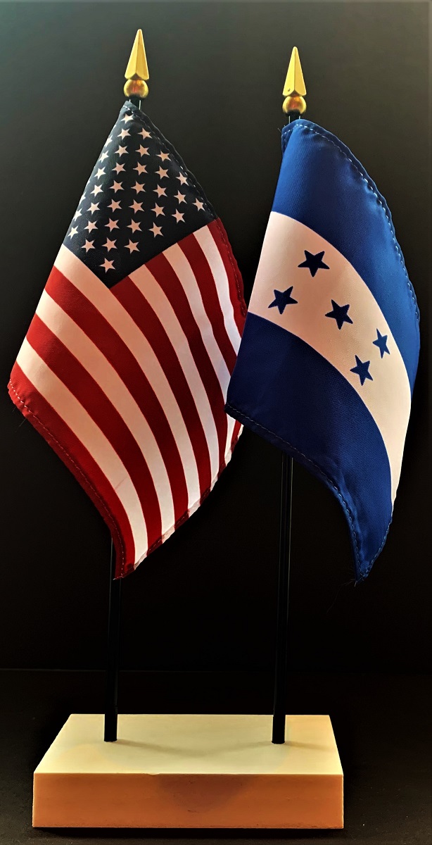 Elevate your workspace with our Honduras and American miniature flag desk set! These silk-like rayon flags, measuring 4x6 inch and are attached to a 10 inch black plastic staff and finished with a gold spear top. Perfect for office, classroom, or table decor. Each set comes with a 4 inch long white flag stand for added display options.