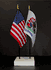This high quality State and US miniature flag desk set is perfect for office, classroom and table decorations. Flags are made of silk-like rayon, measure 4"x6" and are attached to 10" black plastic staff with a gold spear top. All edges are hem stitched. Flag stand measures 4" long, 2.5" wide and stands .75" high.