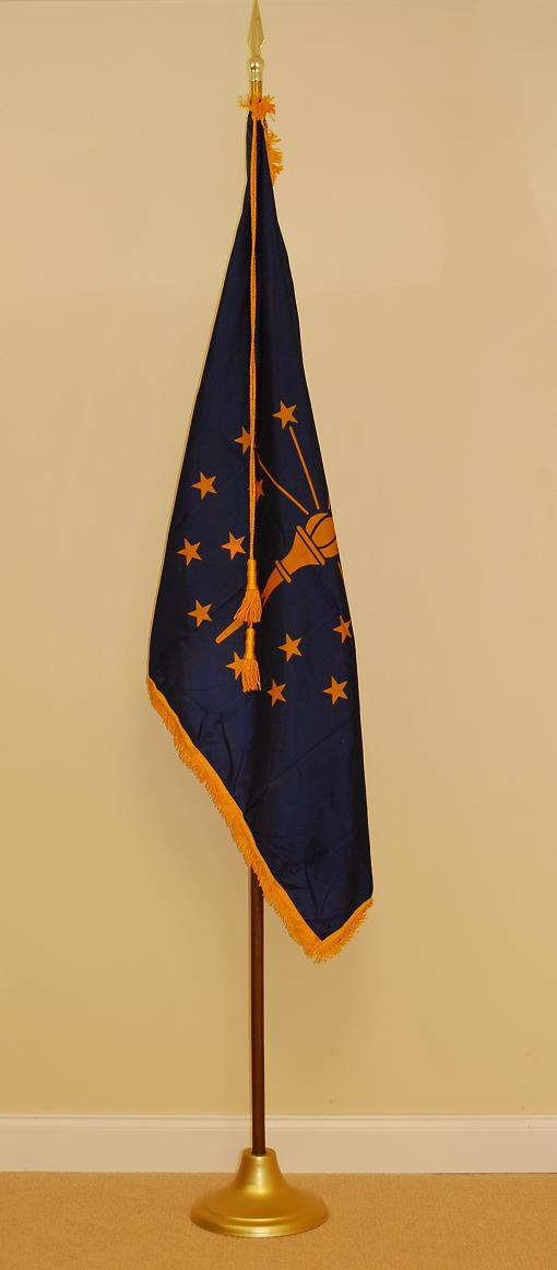 Click photo for larger image. Each State of Indiana indoor flag set includes the 3'x5' gold fringed nylon Indiana state flag with lined pole heading, leather tabs, cord and tassels, 8' polished oak pole with solid brass joint, heavy metal gold anodized stand, and gold plated 7 1/2" metal spear. (American Flag set sold separately).