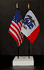 This high quality State and US miniature flag desk set is perfect for office, classroom and table decorations. Flags are made of silk-like rayon, measure 4"x6" and are attached to 10" black plastic staff with a gold spear top. All edges are hem stitched. Flag stand measures 4" long, 2.5" wide and stands .75" high.