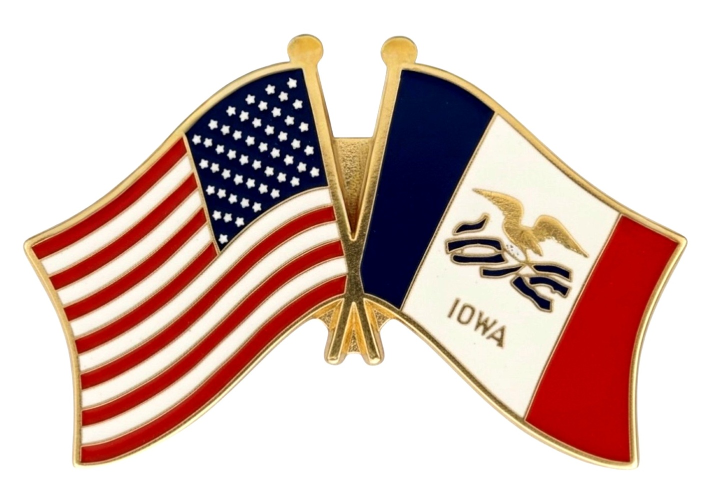 Each Iowa flag friendship lapel pin depicts the US flag on the left along with the Iowa flag on the right. Each pin measures approximately 1" x 3/4" or 28mm x 18.3mm and is the same quality as the single flag lapel pins.