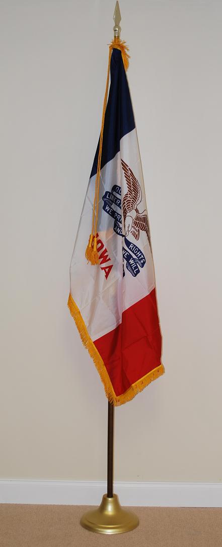 Click photo for larger image. Each State of Iowa indoor flag set includes the 3'x5' gold fringed nylon Iowa state flag with lined pole heading, leather tabs, cord and tassels, 8' polished oak pole with solid brass joint, heavy metal gold anodized stand, and gold plated 7 1/2" metal spear. (American Flag set sold separately).