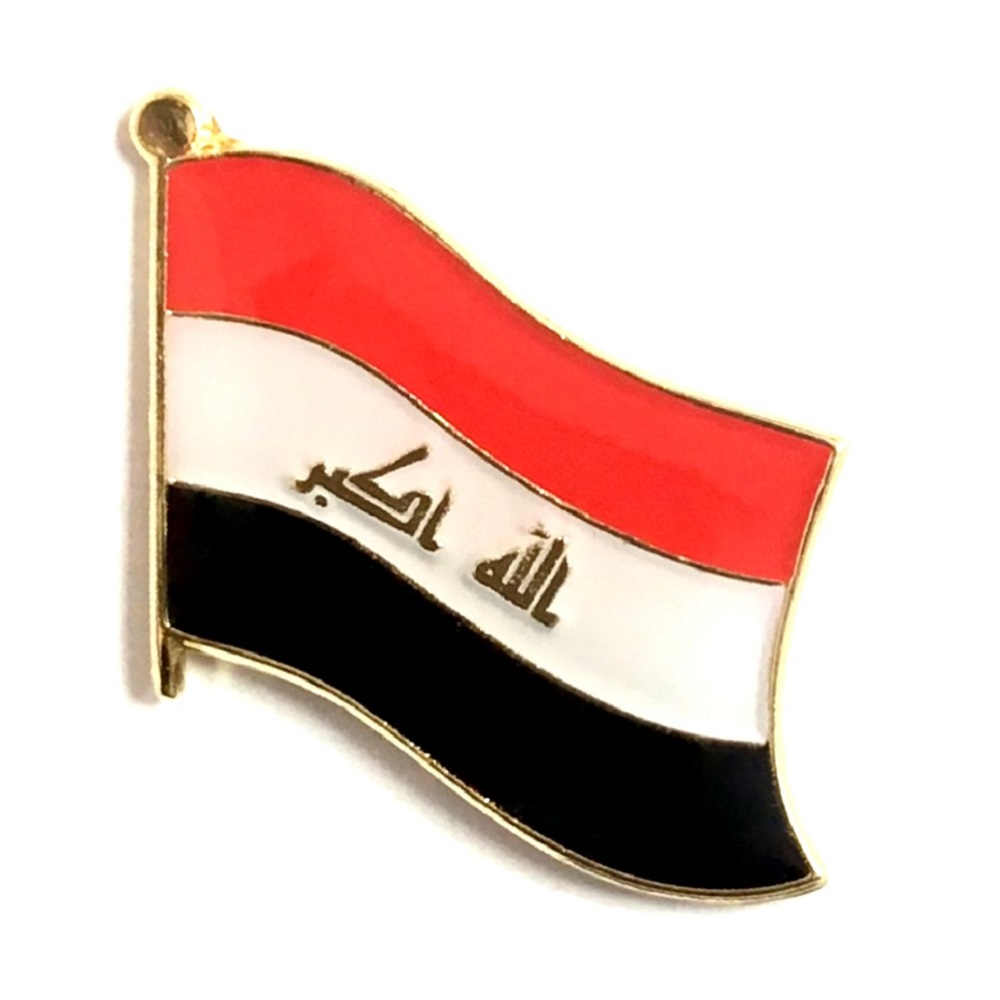 Iraq flag pin measures approximately 1 inch; x 3/4 inch; or 24 mm x 16 mm and has an all metal lacquered design with clutch pin.