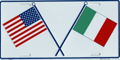 Italian flag and US flag license plate. Metal auto tag measures 6" x 12".