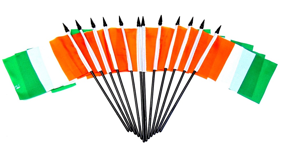 These polyester miniature Ivory Coast flags are sold by the dozen only. Each flag measures 4″x6″ and is attached to a 10″ black plastic staff with black or gold spear top. This is an excellent low price alternative for special events, parades, or table decorations.