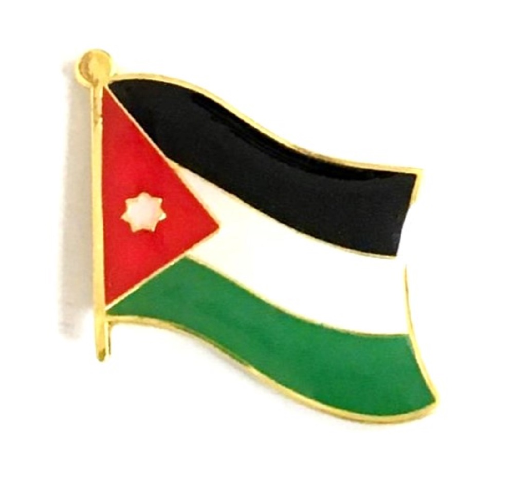 Jordan .flag pin measures approximately 1 inch; x 3/4 inch; or 24 mm x 16 mm and has an all metal lacquered design with clutch pin.
