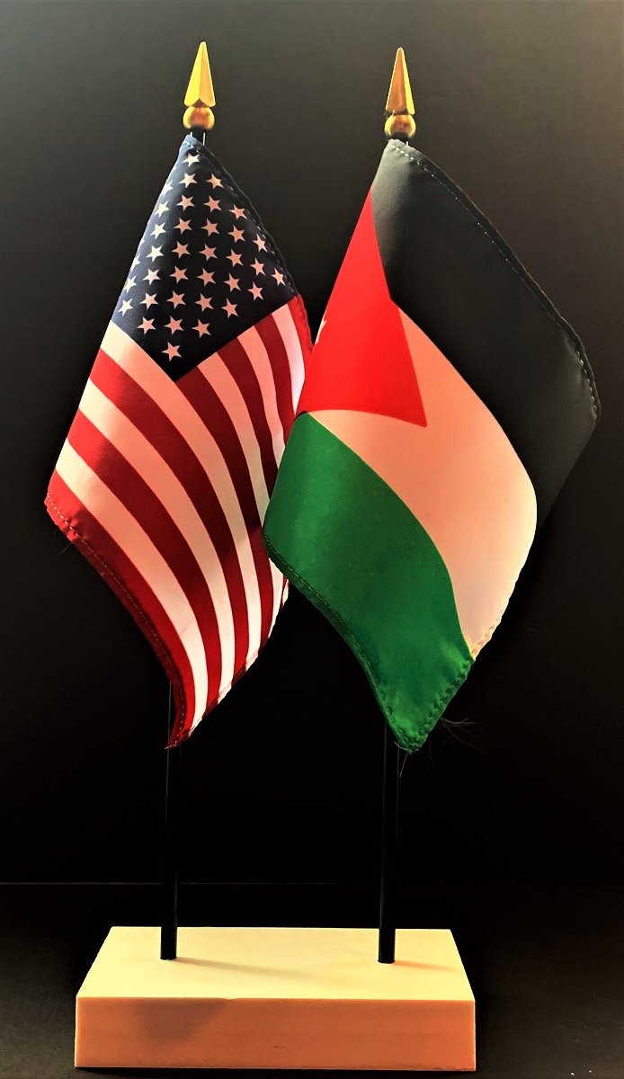 Elevate your workspace with our Jordan and American miniature flag desk set! These silk-like rayon flags, measuring 4x6 inch and are attached to a 10 inch black plastic staff and finished with a gold spear top. Perfect for office, classroom, or table decor. Each set comes with a 4 inch long white flag stand for added display options.