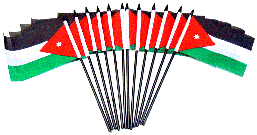 These Jordanian polyester table flags are great for special events, parades and party decorations. They are priced less than the top quality rayon desk flags and are sold only in packs of 12 per order unit. Each Jordanian miniature flag measures 4″x6″ and is attached with a pole hem to a 10″ black plastic staff with a black spear top.
