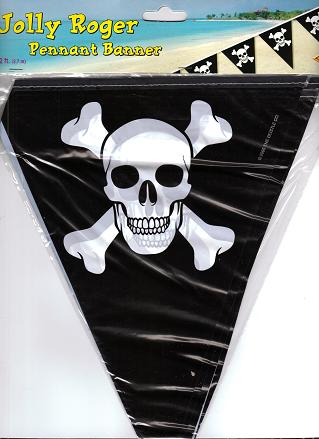 Jolly Roger flag streamers are an all-weather plastic racing pennant banner that measures 12 feet long. These Jolly Roger flag streamers are perfect for display at the race track, around the boat house or as party decorations.