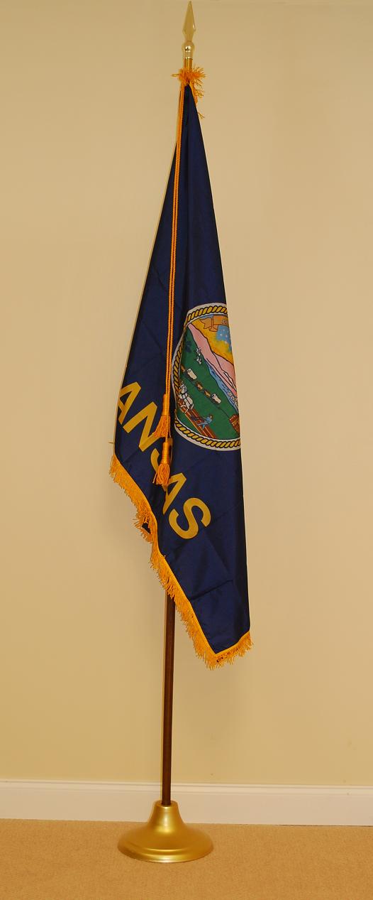 Click photo for larger image. Each State of Kansas indoor flag set includes the 3'x5' gold fringed nylon Kansas state flag with lined pole heading, leather tabs, cord and tassels, 8' polished oak pole with solid brass joint, heavy metal gold anodized stand, and gold plated 7 1/2" metal spear. (American Flag set sold separately).