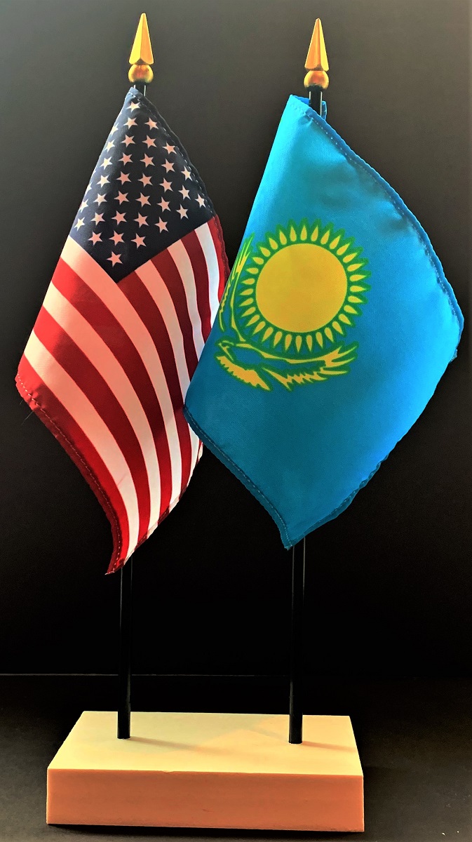 Elevate your workspace with our Kazakhstan and American miniature flag desk set! These silk-like rayon flags, measuring 4x6 inch and are attached to a 10 inch black plastic staff and finished with a gold spear top. Perfect for office, classroom, or table decor. Each set comes with a 4 inch long white flag stand for added display options.