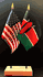 Elevate your workspace with our Kenya and American miniature flag desk set! These silk-like rayon flags, measuring 4x6 inch and are attached to a 10 inch black plastic staff and finished with a gold spear top. Perfect for office, classroom, or table decor. Each set comes with a 4 inch long white flag stand for added display options.