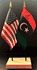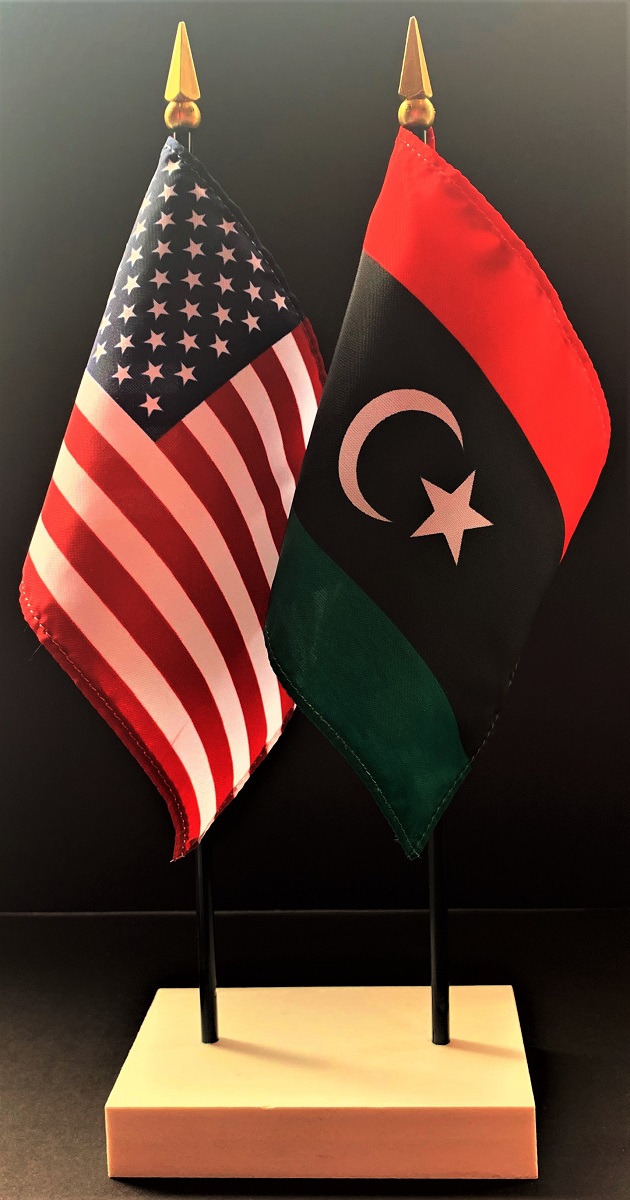 Elevate your workspace with our Libya and American miniature flag desk set! These silk-like rayon flags, measuring 4x6 inch and are attached to a 10 inch black plastic staff and finished with a gold spear top. Perfect for office, classroom, or table decor. Each set comes with a 4 inch long white flag stand for added display options.
