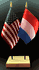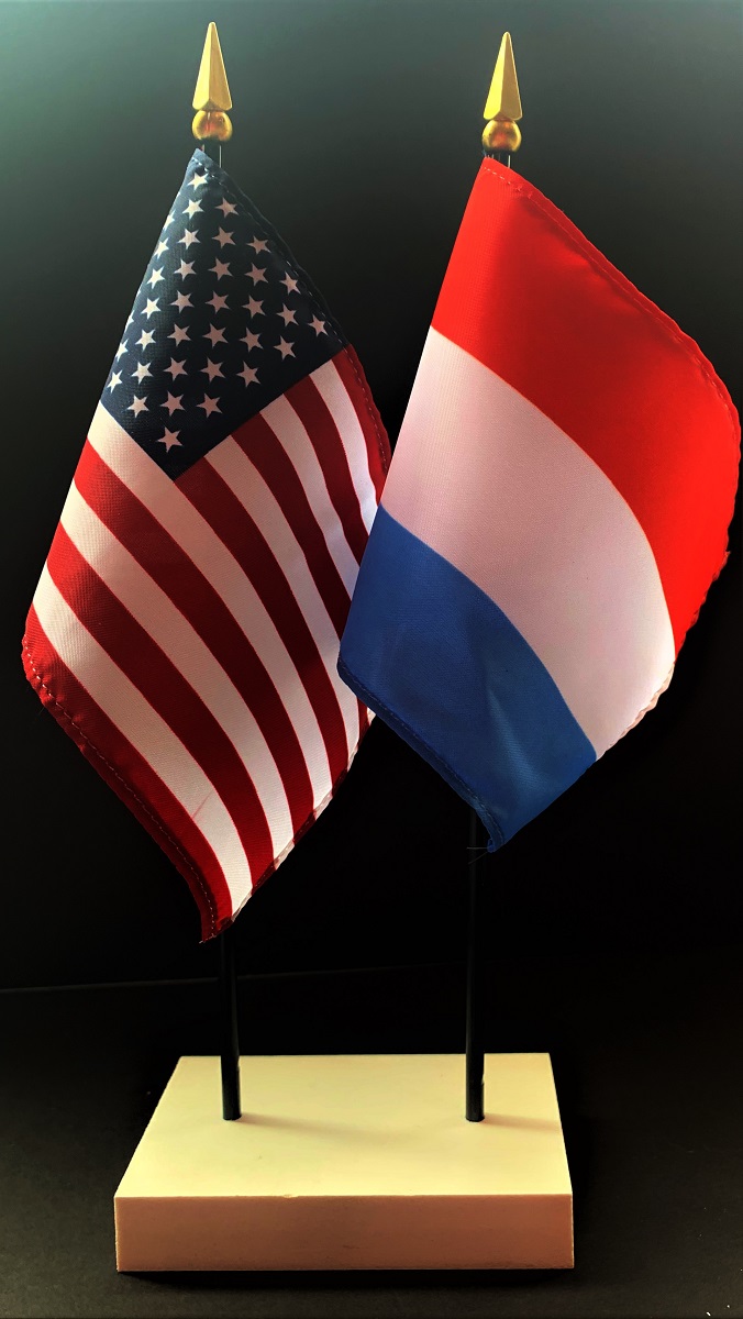 Elevate your workspace with our Luxembourg and American miniature flag desk set! These silk-like rayon flags, measuring 4x6 inch and are attached to a 10 inch black plastic staff and finished with a gold spear top. Perfect for office, classroom, or table decor. Each set comes with a 4 inch long white flag stand for added display options.