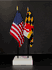 This high quality State and US miniature flag desk set is perfect for office, classroom and table decorations. Flags are made of silk-like rayon, measure 4"x6" and are attached to 10" black plastic staff with a gold spear top. All edges are hem stitched. Flag stand measures 4" long, 2.5" wide and stands .75" high.