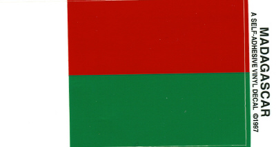Special closeout sale. Buy 25 or more Madagascar vinyl waterproof flag decals and the price is only 40 cents each.