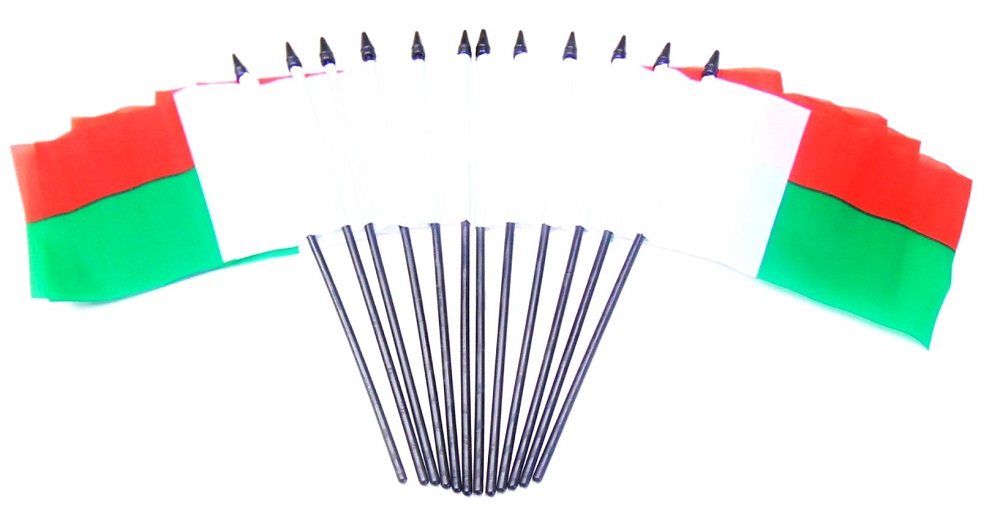 Each Madagascar mini flag measures 4″x6″ and is attached with a pole hem to a 10″ black plastic staff with a black or gold spear top.