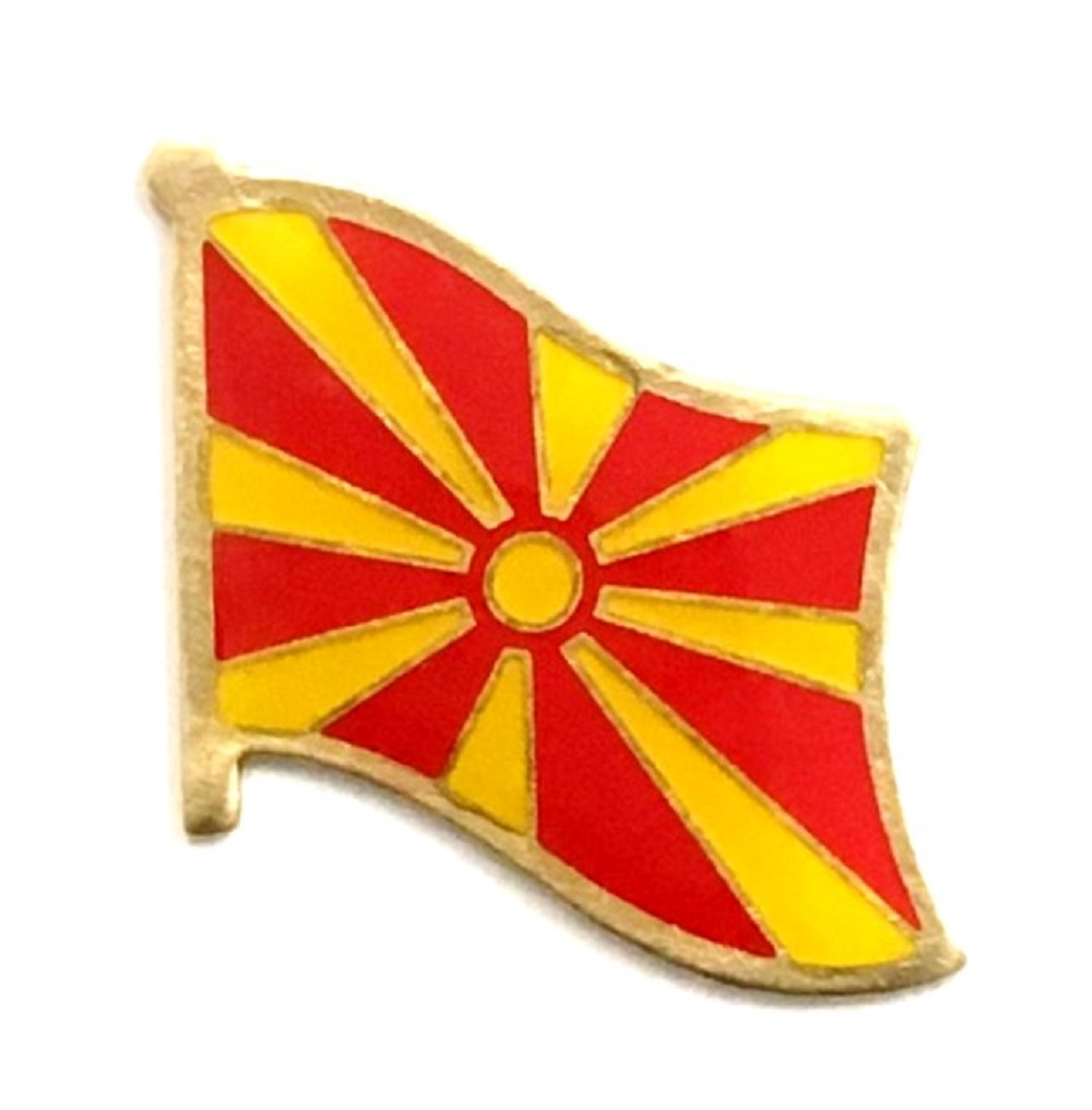 Macedonia flag pin measures approximately 1 inch; x 3/4 inch; or 24 mm x 16 mm and has an all metal lacquered design with clutch pin.