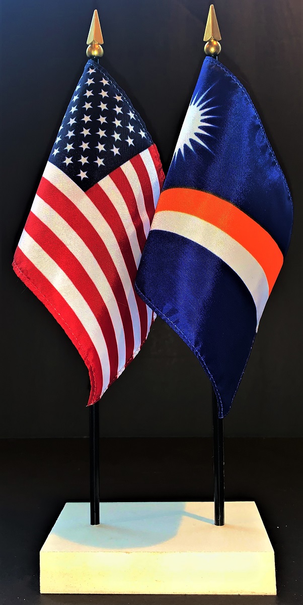 Elevate your workspace with our Marshall Islands and American miniature flag desk set! These silk-like rayon flags, measuring 4x6 inch and are attached to a 10 inch black plastic staff and finished with a gold spear top. Perfect for office, classroom, or table decor. Each set comes with a 4 inch long white flag stand for added display options.