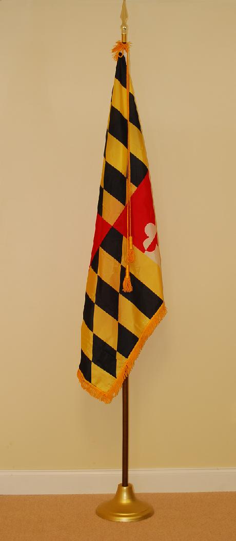 Click photo for larger image. Each State of Maryland indoor flag set includes the 3'x5' gold fringed nylon Maryland state flag with lined pole heading, leather tabs, cord and tassels, 8' polished oak pole with solid brass joint, heavy metal gold anodized stand, and gold plated 7 1/2" metal spear. (American Flag set sold separately).
