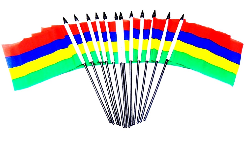 Each Mauritius mini flag measures 4″x6″ and is attached with a pole hem to a 10″ black plastic staff with a black or gold spear top.