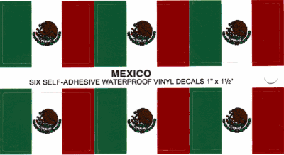 Six waterproof vinyl Mexico flag stickers per card as shown on photo. Each waterproof sticker measures 1" x 1.5". Use on your car, truck, boat, helmet or any other smooth surface. The inks used in these vinyl stickers will resist fading for years.