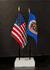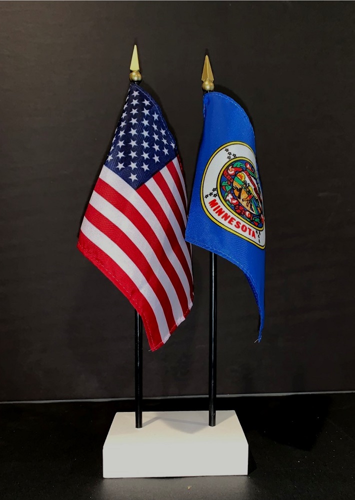 This high quality State and US miniature flag desk set is perfect for office, classroom and table decorations. Flags are made of silk-like rayon, measure 4"x6" and are attached to 10" black plastic staff with a gold spear top. All edges are hem stitched. Flag stand measures 4" long, 2.5" wide and stands .75" high.