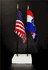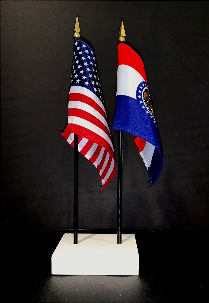 This high quality State and US miniature flag desk set is perfect for office, classroom and table decorations. Flags are made of silk-like rayon, measure 4"x6" and are attached to 10" black plastic staff with a gold spear top. All edges are hem stitched. Flag stand measures 4" long, 2.5" wide and stands .75" high.