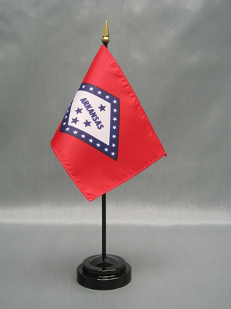 This 4"x6" miniature Arkansas State Flag is made of polyester and attached to a 10" plastic staff. Miniature stick flags are the perfect size for table or desk decorations, parades, school projects and special event displays. Quantity discounts are available when you buy 12 or more.