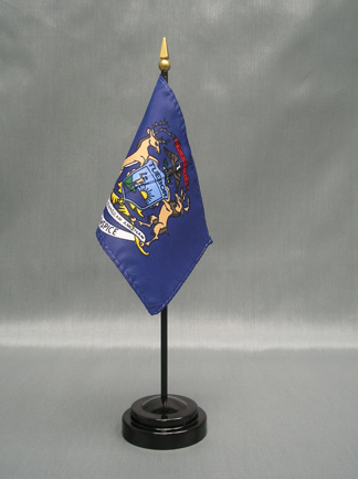 This 4"x6" miniature Michigan State Flag is made of polyester and attached to a 10" plastic staff. Miniature stick flags are the perfect size for table or desk decorations, parades, school projects and special event displays. Quantity discounts are available when you buy 12 or more.