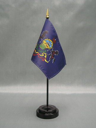 This 4"x6" miniature Pennsylvania State Flag is made of polyester and attached to a 10" plastic staff. Miniature stick flags are the perfect size for table or desk decorations, parades, school projects and special event displays. Quantity discounts are available when you buy 12 or more.