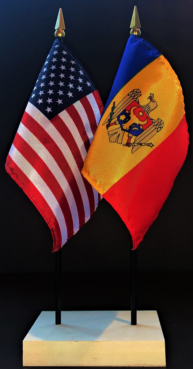 Elevate your workspace with our Moldova and American miniature flag desk set! These silk-like rayon flags, measuring 4"x6", are attached to a 10" black plastic staff and finished with a gold spear top. Perfect for office, classroom, or table decor. Each set comes with a 4" long white flag stand for added display options.