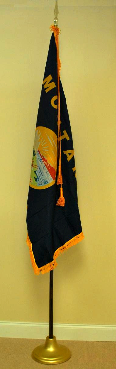 Click photo for larger image. Each State of Montana indoor flag set includes the 3'x5' gold fringed nylon Montana state flag with lined pole heading, leather tabs, cord and tassels, 8' polished oak pole with solid brass joint, heavy metal gold anodized stand, and gold plated 7 1/2" metal spear. (American Flag set sold separately).