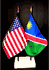 Elevate your workspace with our Namibia and American miniature flag desk set! These silk-like rayon flags, measuring 4"x6", are attached to a 10" black plastic staff and finished with a gold spear top. Perfect for office, classroom, or table decor. Each set comes with a 4" long white flag stand for added display options.
