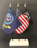 This best selling US Navy military flag set includes a licensed flag of the Navy plus a POW/MIA and US flag. These deluxe miniature military rayon flags measure 4"x6", are attached to a black plastic staff and have a gold spear topper. Each mini flag set comes complete with a solid white 3 hole flag stand. Flag stand measures 4" long, 2.5" wide and stands .75" high.