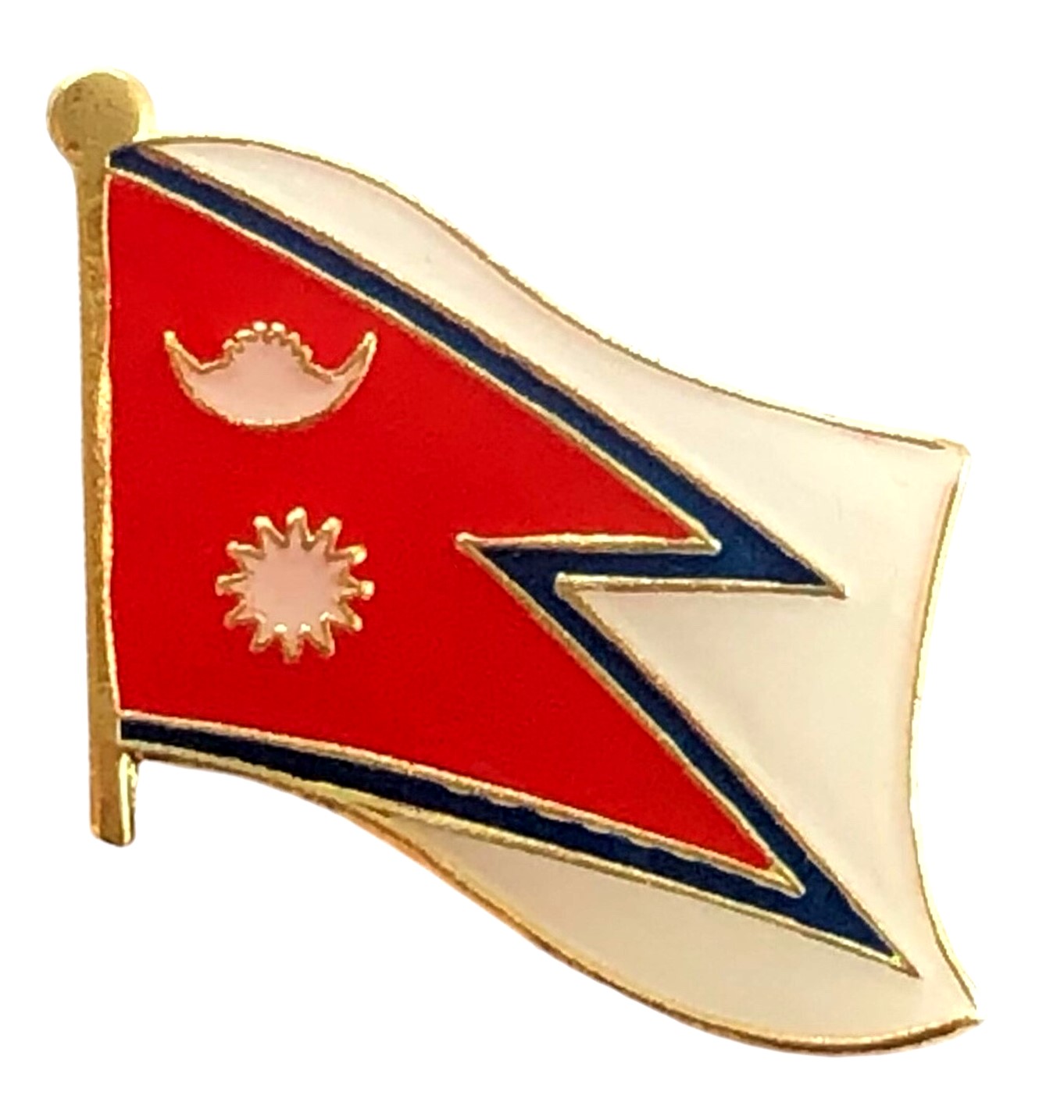 Nepal flag pin measures approximately 1 inch; x 3/4 inch; or 24 mm x 16 mm and has an all metal lacquered design with clutch pin.