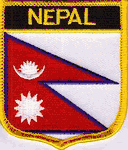 Nepal flag shield patches are fully embroidered and measure 2.25″ x 2.5″. Each patch is trimmed in gold and can be ironed or sewn on.
