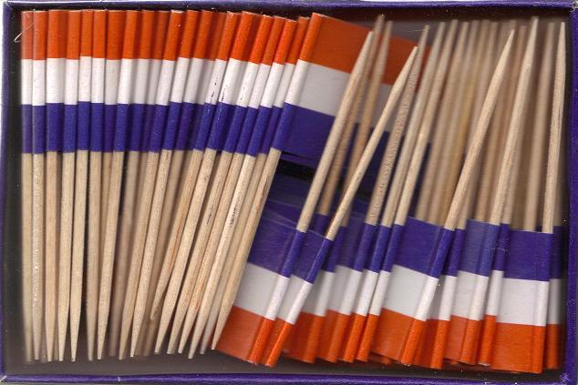 Miniature Netherlands flag toothpick flags make great party and dinner decorations. Each box has 100 flag toothpicks. Each miniature flag is approximately 1″ x 1 1/2″ mounted on a 2 1/2″ toothpick.
