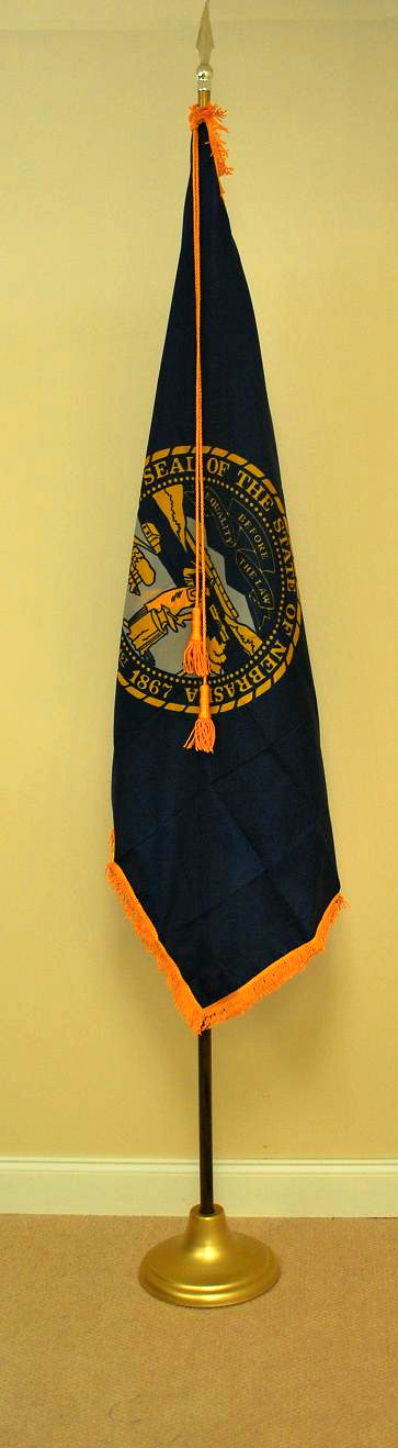 Click photo for larger image. Each State of Nebraska indoor flag set includes the 3'x5' gold fringed nylon Nebraska state flag with lined pole heading, leather tabs, cord and tassels, 8' polished oak pole with solid brass joint, heavy metal gold anodized stand, and gold plated 7 1/2" metal spear. (American Flag set sold separately).