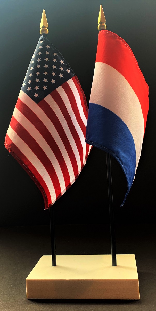 Elevate your workspace with our Netherlands and American miniature flag desk set! These silk-like rayon flags, measuring 4"x6", are attached to a 10" black plastic staff and finished with a gold spear top. Perfect for office, classroom, or table decor. Each set comes with a 4" long white flag stand for added display options.