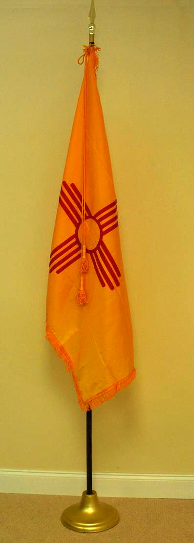 Click photo for larger image. Each State of New Mexico indoor flag set includes the 3'x5' gold fringed nylon New Mexico state flag with lined pole heading, leather tabs, cord and tassels, 8' polished oak pole with solid brass joint, heavy metal gold anodized stand, and gold plated 7 1/2" metal spear. (American Flag set sold separately).