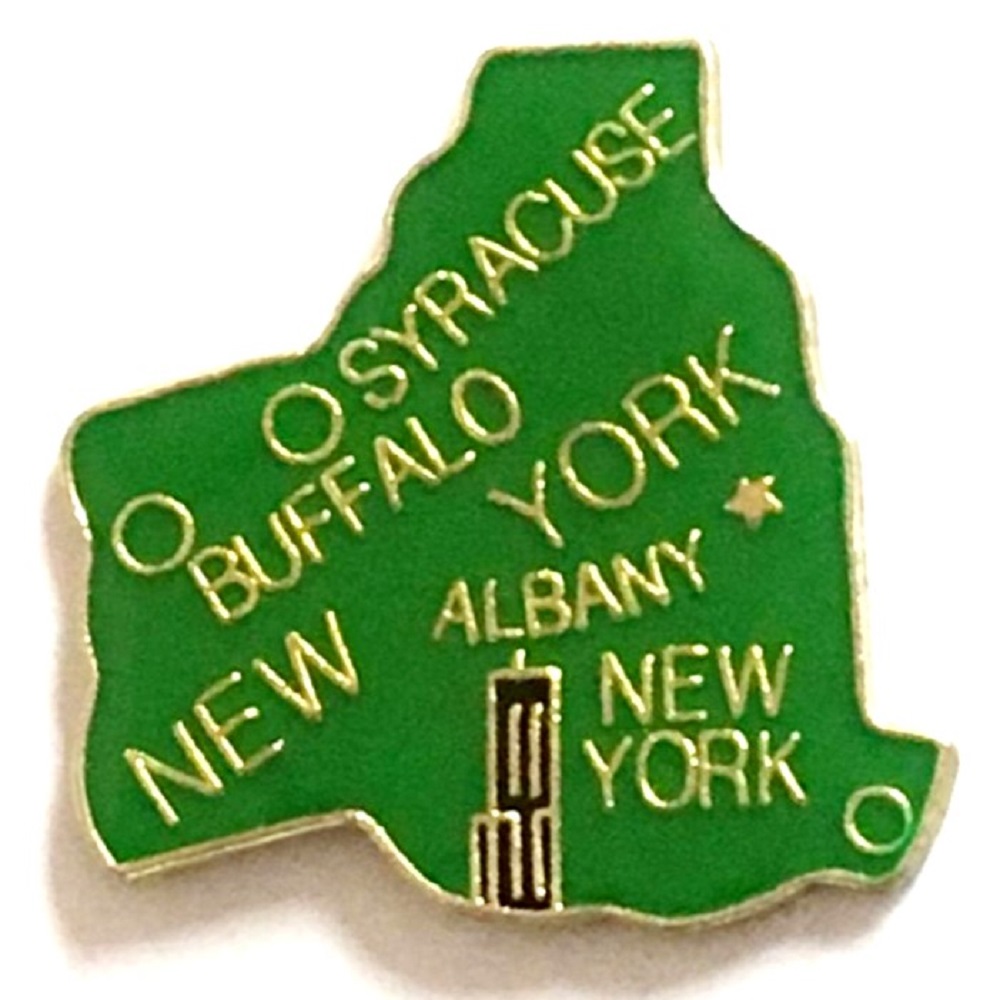 New York map lapel pins are shaped like the map design of the State. Each New York map pin measures approximately 5/8" x 5/8" and has an all metal lacquered design with clutch pin