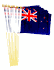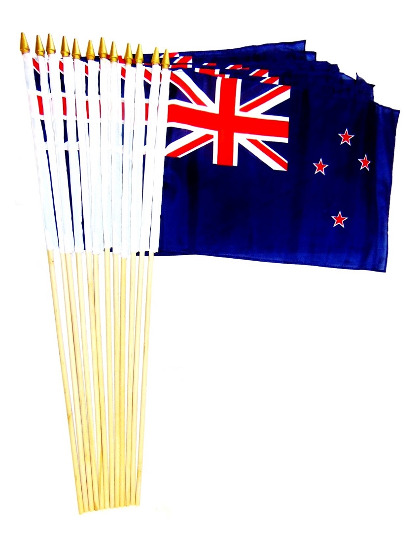 12" x 18" New Zealand stick flags are great for parades, sporting events, rallies and special event decorations. The flags are made of polyester with the design crisp on both sides of the flag and are sold in packs of 12. All four sides of the flag are stitched and each flag is mounted with a pole hem to a 24" wood staff with a gold spear top.