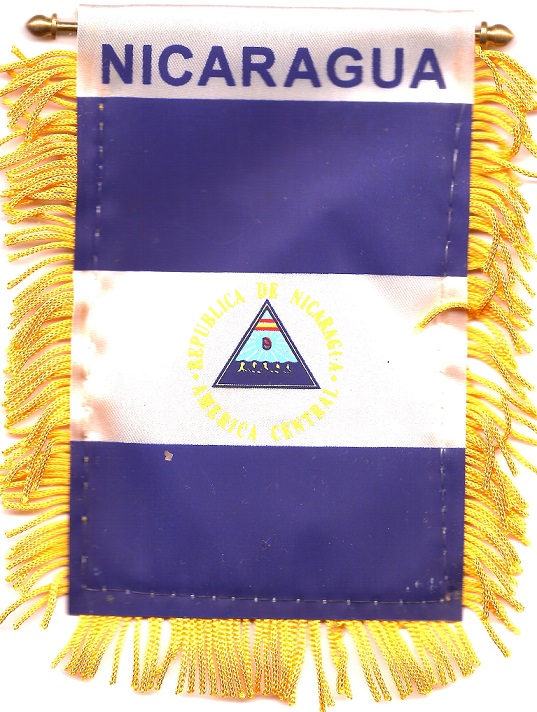 Nicaragua car windshield, window or mirror mini banner flags measure 3 1/2" x 5" and are great ways to show your Nicaraguan heritage. Each flag has a gold fringe with a string for hanging over your car mirror, and a suction cup to attach the mini flag to your windshield or car window.