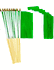 12" x 18" Nigerian stick flags are great for parades, sporting events, rallies and special event decorations. The flags are made of polyester with the design crisp on both sides of the flag and are sold in packs of 12. All four sides of the flag are stitched and each flag is mounted with a pole hem to a 24" wood staff with a gold spear top.