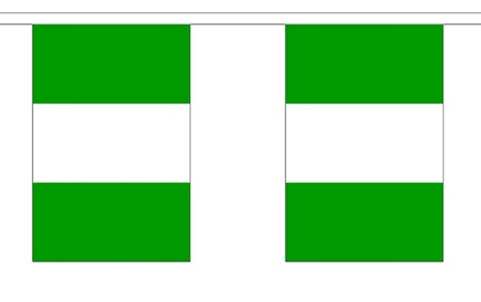 Nigerian string flag bunting is available in 30′ string with 30 6″x9″ polyester flags. The 30′ strings can be cut to fit the size that you need in the space available.