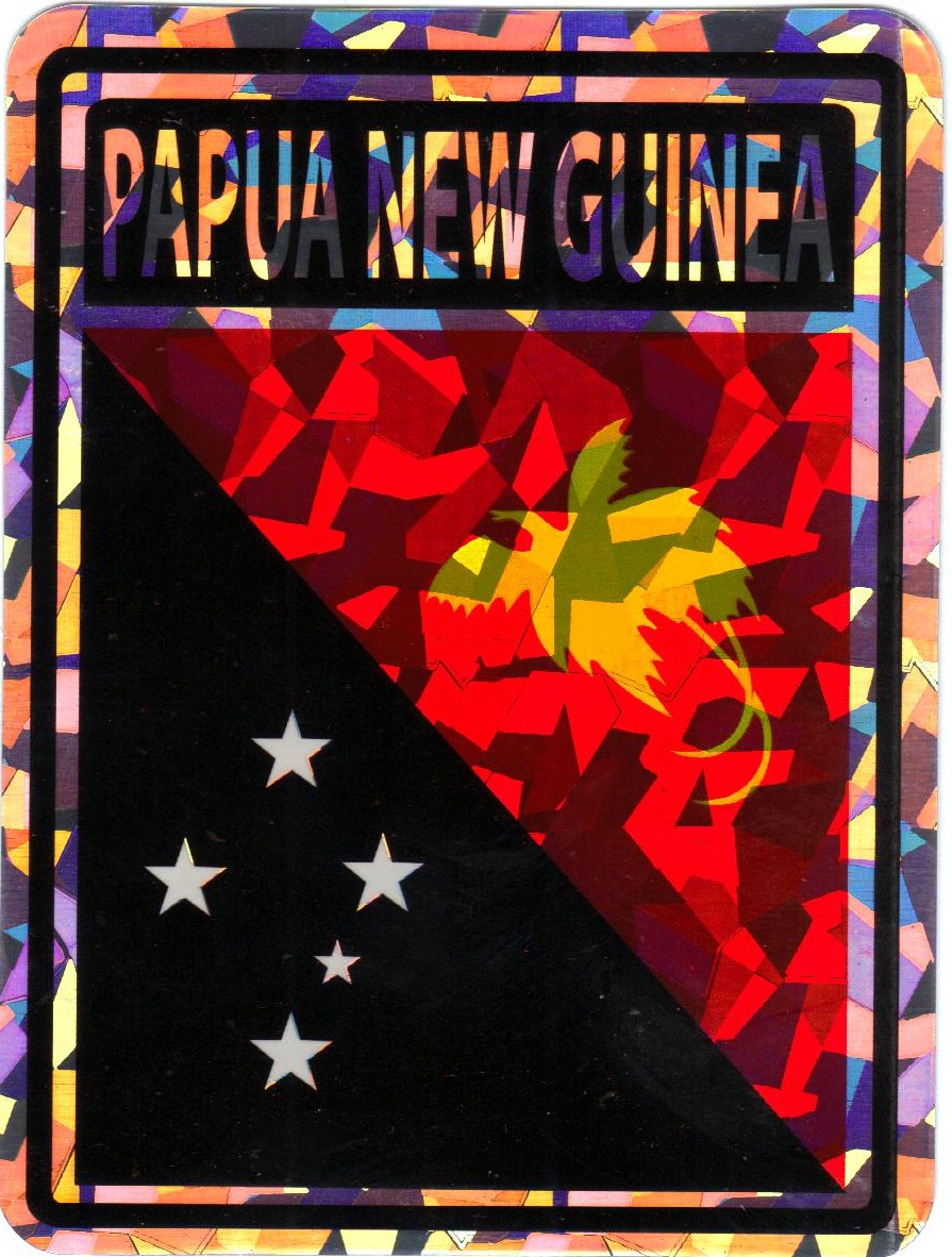Papua New Guinea prismatic reflective decal stickers are made of waterproof vinyl. Decals measure 3"x4" and can be used outdoors in all weather. Great for attaching to your car, truck or boat. Decorate your home or automobile and show your Papua New Guinean pride.