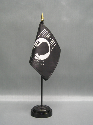 This 4"x6" deluxe miniature POW/MIA Flag is made of rayon, stitched on all 4 sides and attached to a 10" plastic staff with a gold spear top. Miniature stick flags are the perfect size for table or desk decorations, parades, school projects and special event displays. Quantity discounts are available when you buy 12 or more.